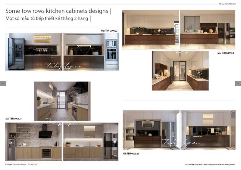 Một số mẫu thiết kế tủ bếp hiện đại được thiết kế theo phong cách thời thượng với kiểu song song trong một không gian dài và tiện nghi.