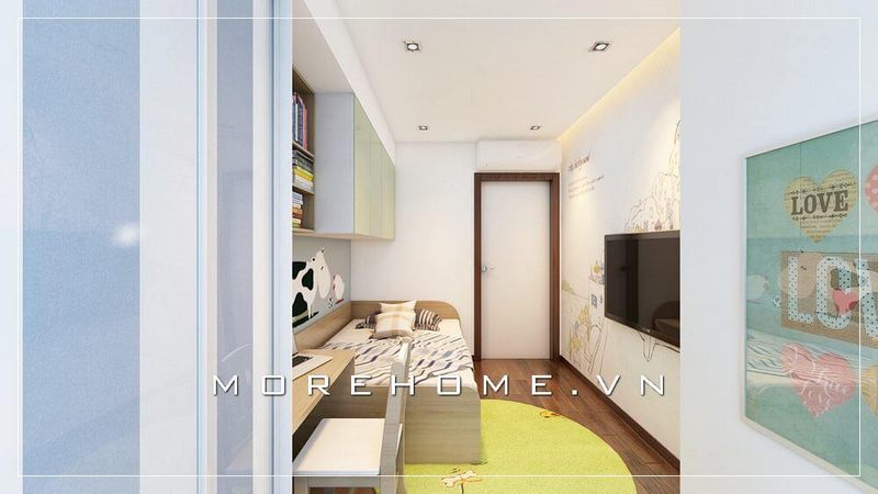 Bố trí nội thất phòng ngủ nhỏ nhà phố cho bé trai với những chi tiết hoạt hình đầy ấn tượng, kết hợp với sắc xanh tươi mới để phù hợp với sở thích của trẻ.